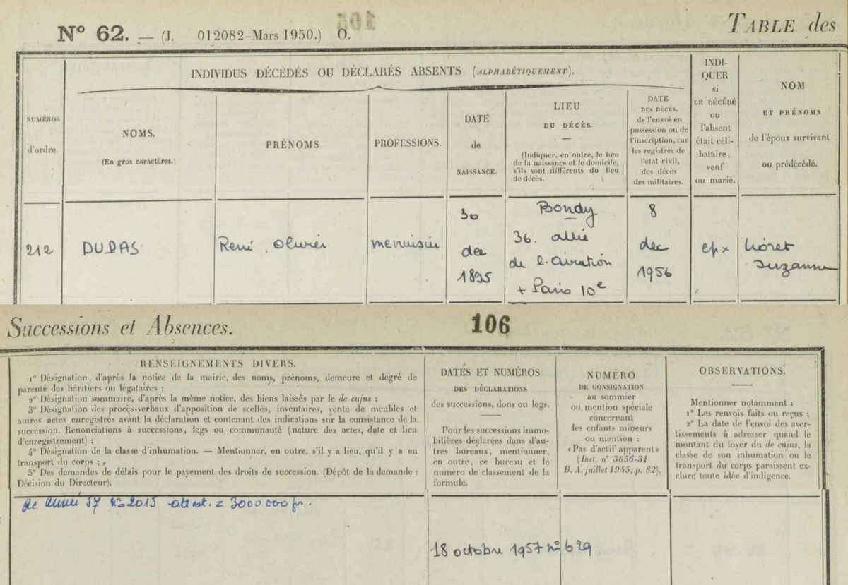 Décès de sa fille Suzanne Dupas le 5 août à Bondy (Seine-Saint-Denis)