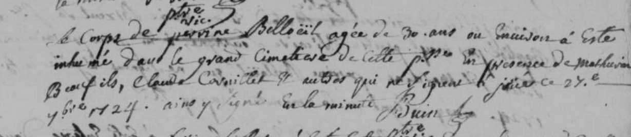Perrine Beloeil, fille de Léger Beloeil et de Jeanne Guihard, a été baptisée le 28 octobre 1695 à Joué-sur-Erdre (Loire-Atlantique) (1). Elle a été inhumée le 27 septembre 1724 à Joué-sur-Erdre (Loire-Atlantique) (3).