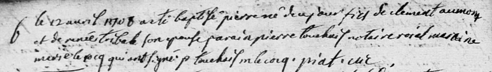 Pierre Aumont, fils de Clément Aumont et de Renée Triballe, a été baptisé le 12 avril 1708 à Mozé-sur-Louet (Maine-et-Loire) (1). Il est décédé le 6 novembre 1747 à Mûrs (Maine-et-Loire) (3) et a été inhumé le lendemain (3).