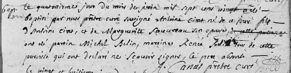 Antoine Ciret, fils de Antoine Siret et de Marie Saucereau, est né le 14 juin 1720 à Saint-Georges-des-Sept-Voies (Maine-et-Loire) (1) et a été baptisé le même jour (1).