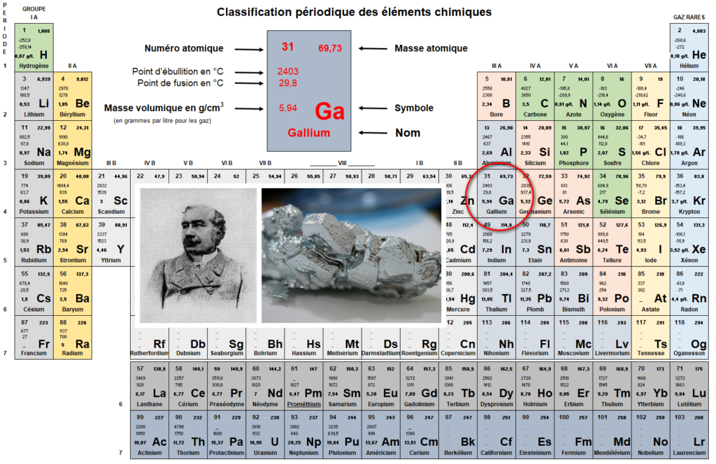 Dmitri Mendeleïev avait prévu l’existence du Gallium dans l’élaboration de son tableau. Il a été découvert en 1875 par Paul-Émile Lecoq de Boisbaudran à partir d’échantillons de sulfure de zinc. Le gallium a été baptisé par son découvreur, et c’est à la Gaule (Gallia) et non au patronyme latinisé du savant (Lecoq = Gallus) que revient la véritable étymologie de cet élément.