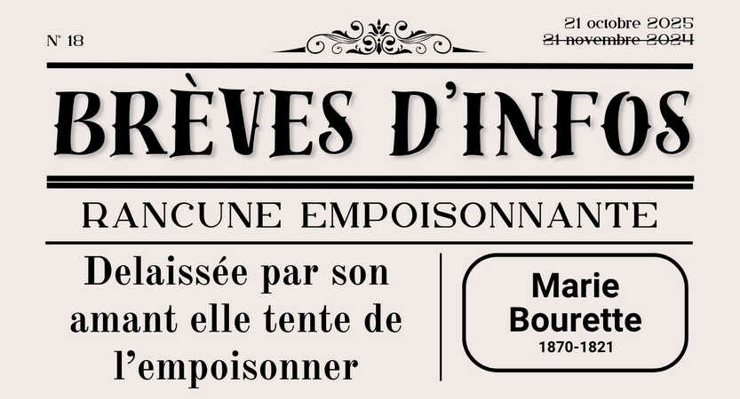 Sans rancune, deux mots que l’on a probablement tous dit, au moins un jour dans sa vie, et qui invitent à la réconciliation. A vrai dire, cela vaut mieux car la rancune est une colère qui s’installe en nous et peut durer très très très longtemps. Celle-ci est provoquée par un désir de vengeance et apparaît lorsqu’une émotion négative est ressentie à la suite d’une offense ou d’un préjudice. Visiblement, le pardon n’existe pas pour une personne rancunière, elle va manifester un sentiment d’animosité durable et profond à l’encontre de celui ou celle qui l’a offensée. Sans rancune, n’est visiblement pas dans le vocabulaire de Marie Louise Aurélie Bourette, une lointaine cousine. Bien au contraire! Parce qu’elle est particulièrement rancunière, Marie va faire les gros titres et défrayer la chronique en 1910.