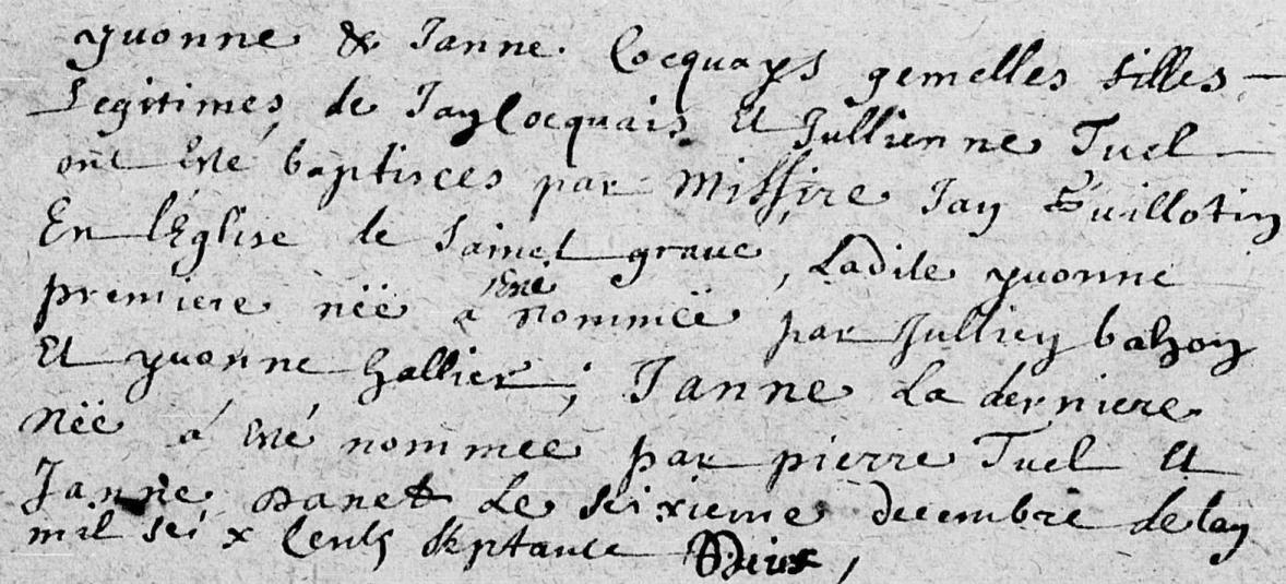 Yvonne et Jeanne sont les filles de Jean Cocquais et Julienne Tual et ont été baptisées le 6 décembre 1672 à Saint-Gravé dans le Morbihan. Jeanne s’est mariée en 1704 à Saint-Gravé avec Jacques Sabo et je n’en sais pas plus la concernant pour le moment. Yvonne, quant à elle, a épousé Jean Danet en 1705, toujours à Saint-Gravé, et je lui connais 2 enfants. Elle décède le 6 septembre 1740 au Beauchat de Saint-Gravé.