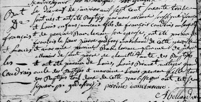 Nous sommes donc de retour dans le Maine-et-Loire pour les jumeaux suivants : Louis et François Coudrais qui ont vu le jour le 19 janvier 1773 à la Salle-de-Vihiers. Ils sont nés de François et Perrine Banchereau, laquelle comptait dans sa fratrie une paire de jumelles : Catherine et Jeanne. Par la suite, Louis qui est cabaretier comme son père, épousera en 1795 à Doué-la-Fontaine, Marguerite Pinon, avec laquelle il aura 6 enfants. Il décédera dans cette même ville en 1820.
