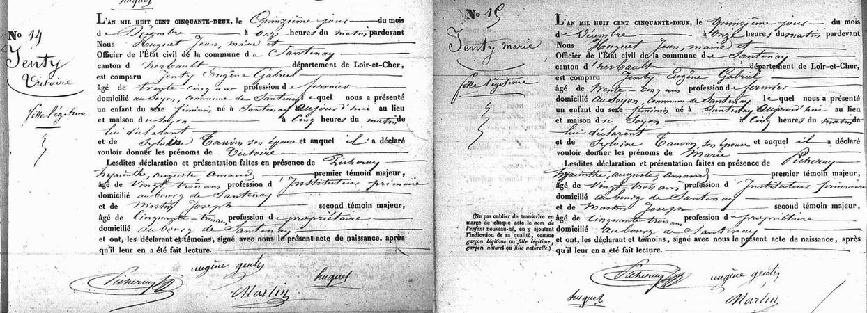 Le 15 décembre 1852, Eugène Gabriel Genty, fermier au Soyon de Santenay, dans le Loir-et-Cher, se rend à la mairie. Il présente alors deux enfants de sexe féminin nées le matin, de lui et de Sylvine Tauvin, son épouse. A la suite de quoi, il donne à la première, la sosa 47, le prénom de Victoire, puis, à la deuxième celui de Marie. Victoire monte à Paris vers 1875 avec Louis Debout, qu’elle épouse en 1878. Ils légitiment ainsi leur 3 premiers enfants avant les 4 autres qui suivront. Veuve en 1903, Victoire finit sa vie à Saint-Germain-en Laye où elle décède âgée de 78 ans.