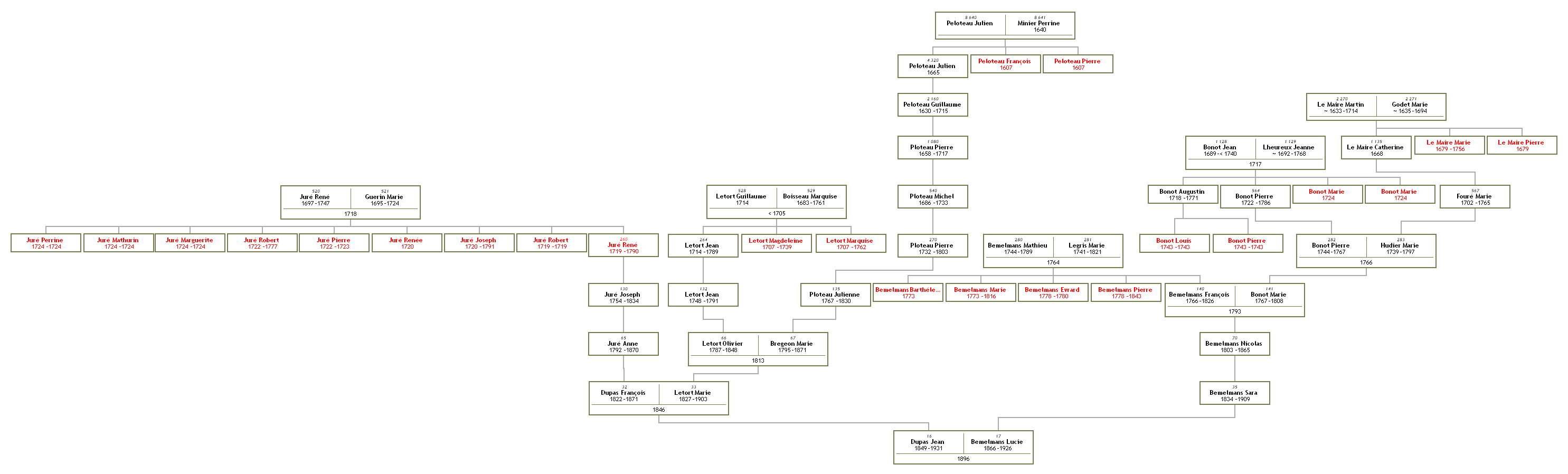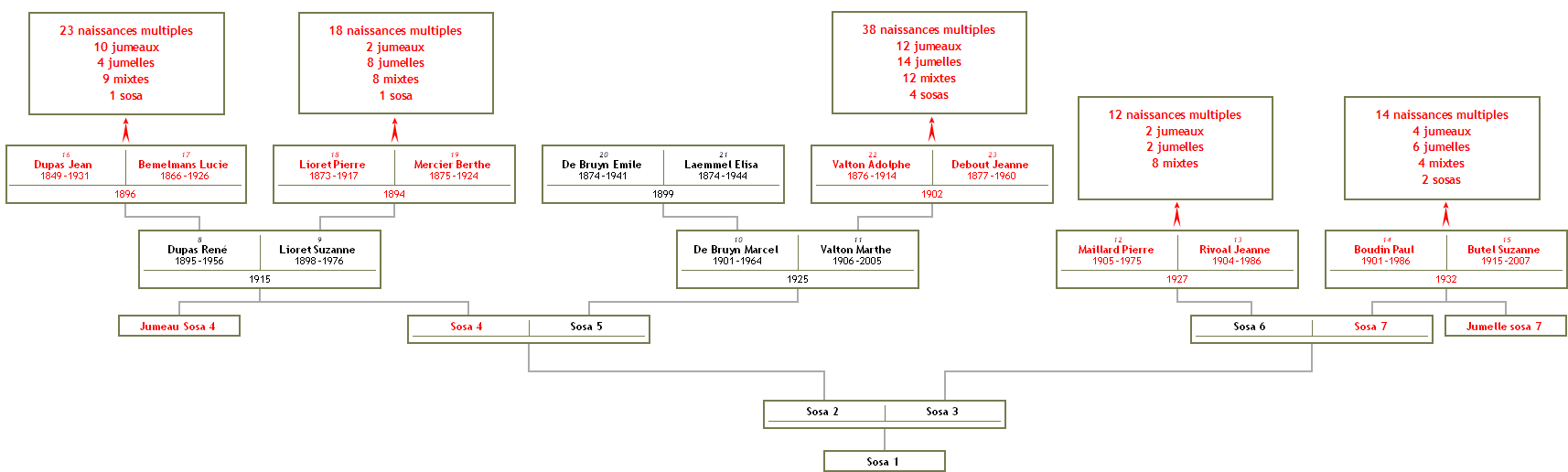C’est une branche qui va de la Bretagne à l’Ile-de-France, et dans laquelle, on comptabilise alors 10 paires de jumeaux et des triplés. De surcroît, parmi tous les couples de cette branche, 2 d’entre eux ont eu plusieurs naissances multiples. A la génération 9 dans la Brie, Mathieu Bemelmans et Marie Anne Legris ont eu 2 paires de jumeaux, et à la génération 10, dans la vallée de l’Erdre, René Juré et Marie Guerin ont eu quant à eux 3 paires de jumeaux et des triplés, dont René, sosa 260 et son frère Robert.