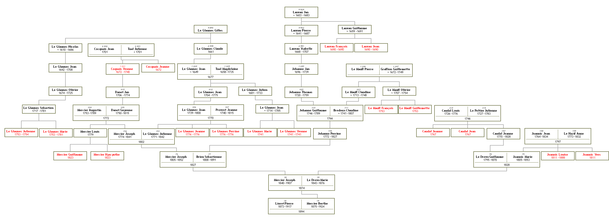 Voici une branche purement morbihannaise dans laquelle on découvre 9 paires de jumeaux et un seul sosa. Plutôt une seule, Yonne Cocquais, sosa 1221 qui a eu une sœur jumelle s’appelant Jeanne.