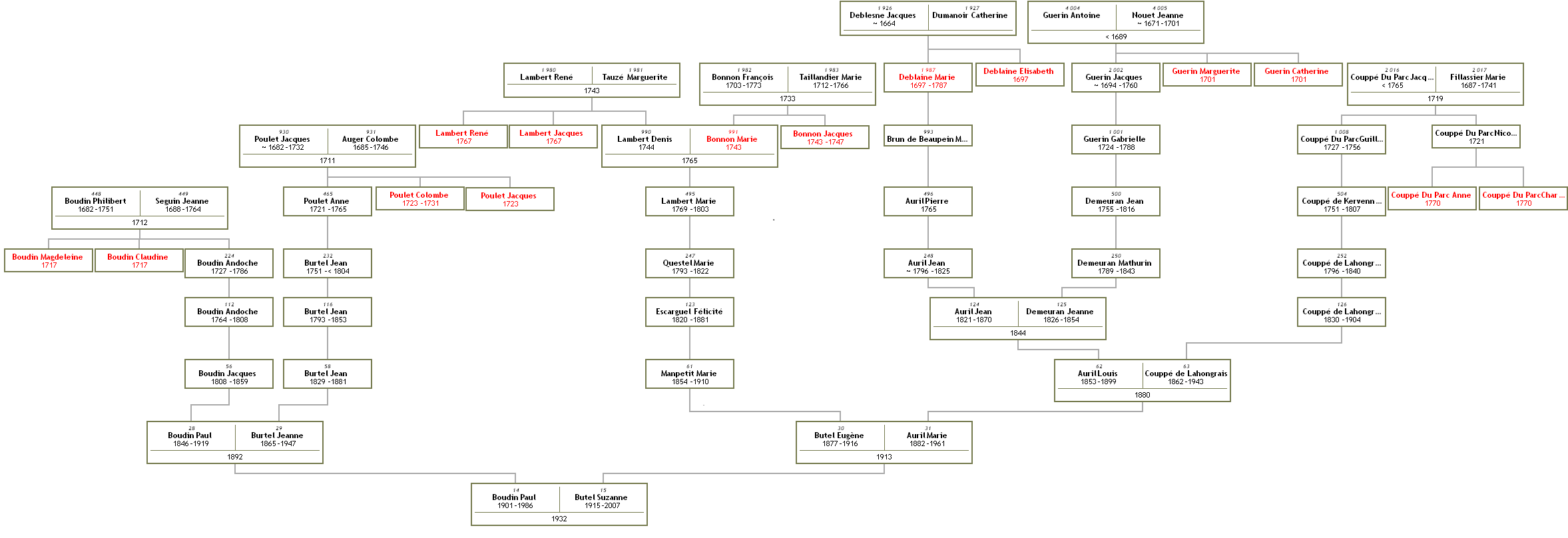 Évidement, je ne vais pas oublier ceux qui sont plus proches de nous : 2 des grands-parents de mes enfants. C’est à dire, la sosa 7 et sa jumelle, filles de de Paul Boudin et de Suzanne Butel et le sosa 4 et son jumeau, fils de René Dupas et Suzanne Lioret.