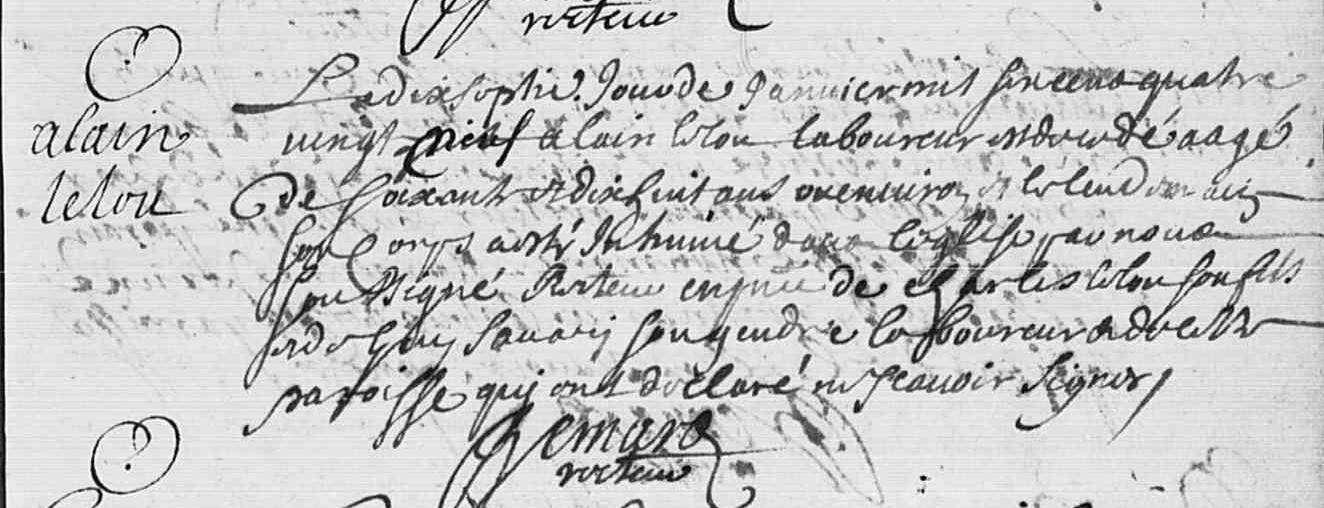 Alain Lelou (1615-1689) , x 1637 Nicole Georget (✝ 1675)- 1 Charles Lelou (1654-1715) , x 1679 Françoise Chevalier (1659-1728)