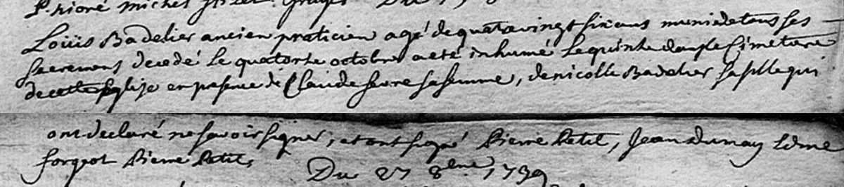 Louis Badelier, est né vers 1653. Il est décédé le 14 octobre 1739 à Maizières-la-Grande-Paroisse (Aube) (2) et a été inhumé le lendemain (2).