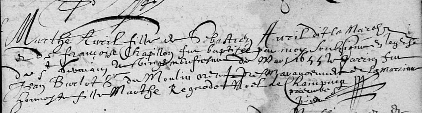 Marthe Marie Auril, fille de Sébastien Auril (✝ av 1675) et de Françoise Chapillon, a été baptisée le 29 mars 1655 à Saint-Pierre-de-Surgères (Charente-Maritime) (1). Elle est décédée le 27 avril 1719 à La Rochelle - Saint-Jean du Pérot (Charente-Maritime) (3) et a été inhumée le lendemain (3).