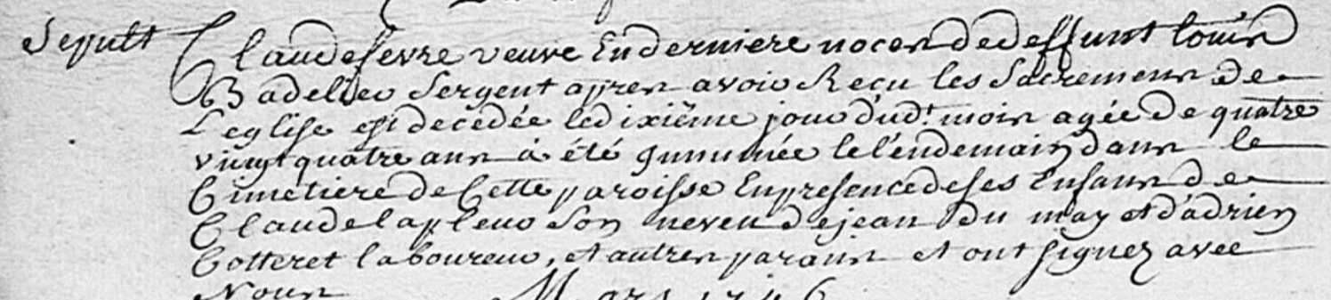 Claude Fevre, est née vers 1662. Elle est décédée le 10 février 1746 à Maizières-la-Grande-Paroisse (Aube) (2) et a été inhumée le lendemain (2).