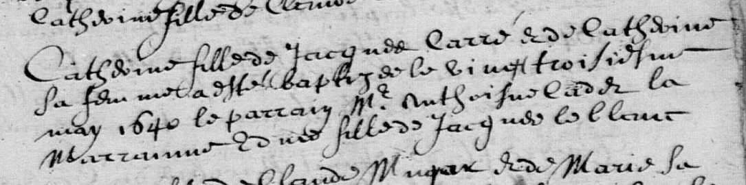 Catherine Carré, fille de Jacques Carré et de Catherine Legros, a été baptisée le 23 mai 1640 à La Celle-sous-Chantemerle (Marne) (1). Elle est décédée le 26 mars 1703 à La Celle-Saint-Avant (Indre-et-Loire) (3) et a été inhumée le lendemain à La Celle-sous-Chantemerle (3).