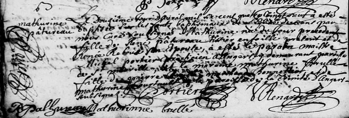 Mathurine Patureau, fille de René Patureau et de Renée Reboux, est née le 11 avril 1689 à Saint-Lambert-la-Potherie (Maine-et-Loire) (1) et a été baptisée le lendemain (1). Elle a été inhumée le 2 décembre 1712 à Saint-Lambert-la-Potherie (Maine-et-Loire) (3).