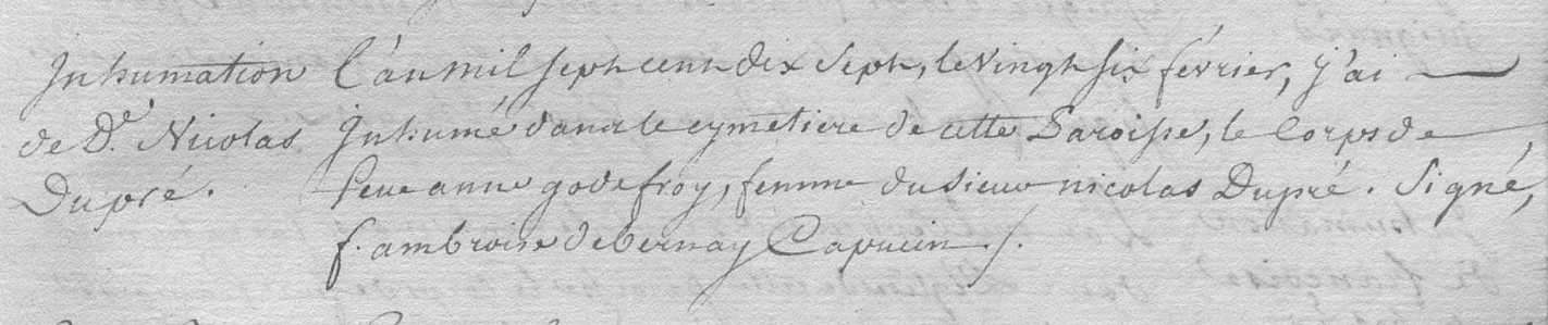 Anne Godefroy (✝ 1717) , x Nicolas Dupré (ca 1655-1715)- 1 Jacques Dupré (✝ 1740) , x 1720 Marie Moreau (✝ av 1746)