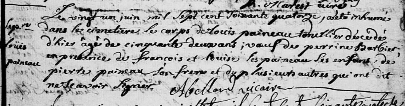 Louis Paineau, fils de François Paineau et de Perrine Guilbaud, est né le 22 décembre 1722 à La Salle-de-Vihiers (Maine-et-Loire) (1) et a été baptisé le même jour (1). Il est décédé le 20 juin 1774 à La Salle-de-Vihiers (Maine-et-Loire) (3) et a été inhumé le lendemain (3).