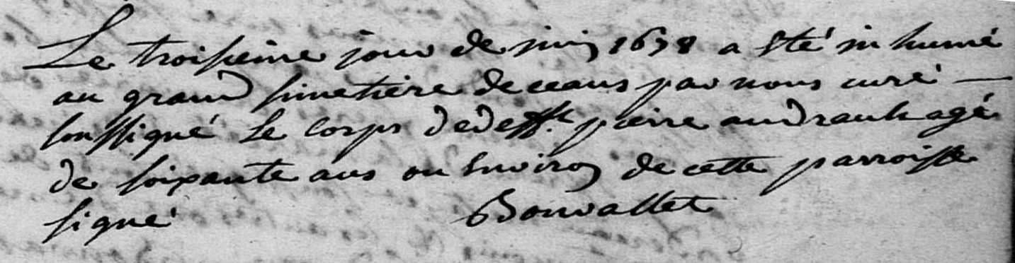 Pierre Andrault, est né vers 1618. Il a été inhumé le 3 juin 1678 à Mozé-sur-Louet (Maine-et-Loire) (1).