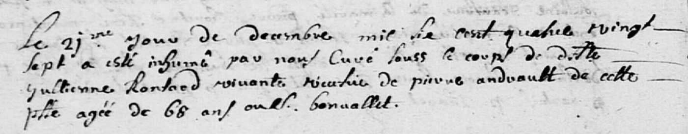 Julienne Rontard, est née vers 1619. Elle a été inhumée le 21 décembre 1687 à Mozé-sur-Louet (Maine-et-Loire) (1).