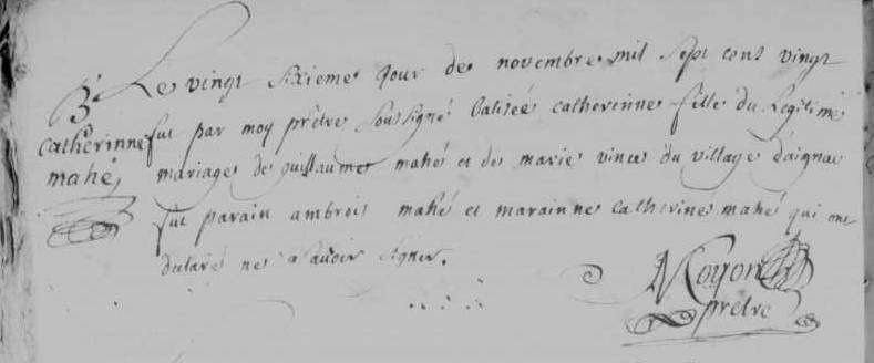 Catherine Mahé, fille de Guillaume Mahé et de Marie Vince, a été baptisée le 26 novembre 1720 à Montoir - Ile d'Aignac (Loire-Atlantique) (1). Elle est décédée avant 1800.