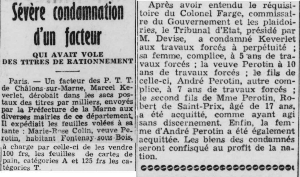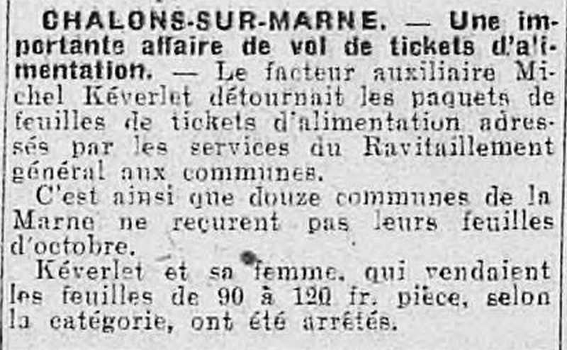En 1942, Michel travaille comme facteur auxiliaire à Chalons-sur-Marne et bien évidemment il voit transiter les sacs postaux contenant les feuilles de tickets de rationnement à destination des mairies alentours. Nous sommes en pleine occupation allemande depuis 2 ans et la situation des Français n’est pas vraiment ce qu’il y a de mieux. Michel a dû se dire que prendre quelques titres et les revendre était un moyen de mettre un peu de beurre dans les épinards. Enfin, quand je dis quelques titres, je suis loin du compte, car notre facteur s’est servi allégrement en délestant les sacs de plus de 30 000 feuilles de tickets entre août et septembre 1942. Michel et sa femme ont alors vendu leur butin et à raison de 90 à 120 francs la feuille, selon le type d’aliment, et se sont fait un petit pactole de 80 000 francs, ce qui ferait selon le convertisseur franc-euro de l’INSEE près de 2 700 000 euros! Seulement voilà, l’appât du gain fait généralement perdre le sens de la réalités. Michel ne s’est visiblement pas dit, qu’en dérobant une telle quantité de titres, cela allait être un manque pour certaines mairies. En effet, ces dernières constatant qu’elles n’avaient pas reçu leurs feuilles de tickets pour le mois d’octobre ont prévenu les autorités. En moins de temps qu’il faut pour le dire, Michel et sa femme Odette ont été arrêtés le 1ier octobre 1942 et finalement n’ont pas pu vraiment profiter de leur magot.